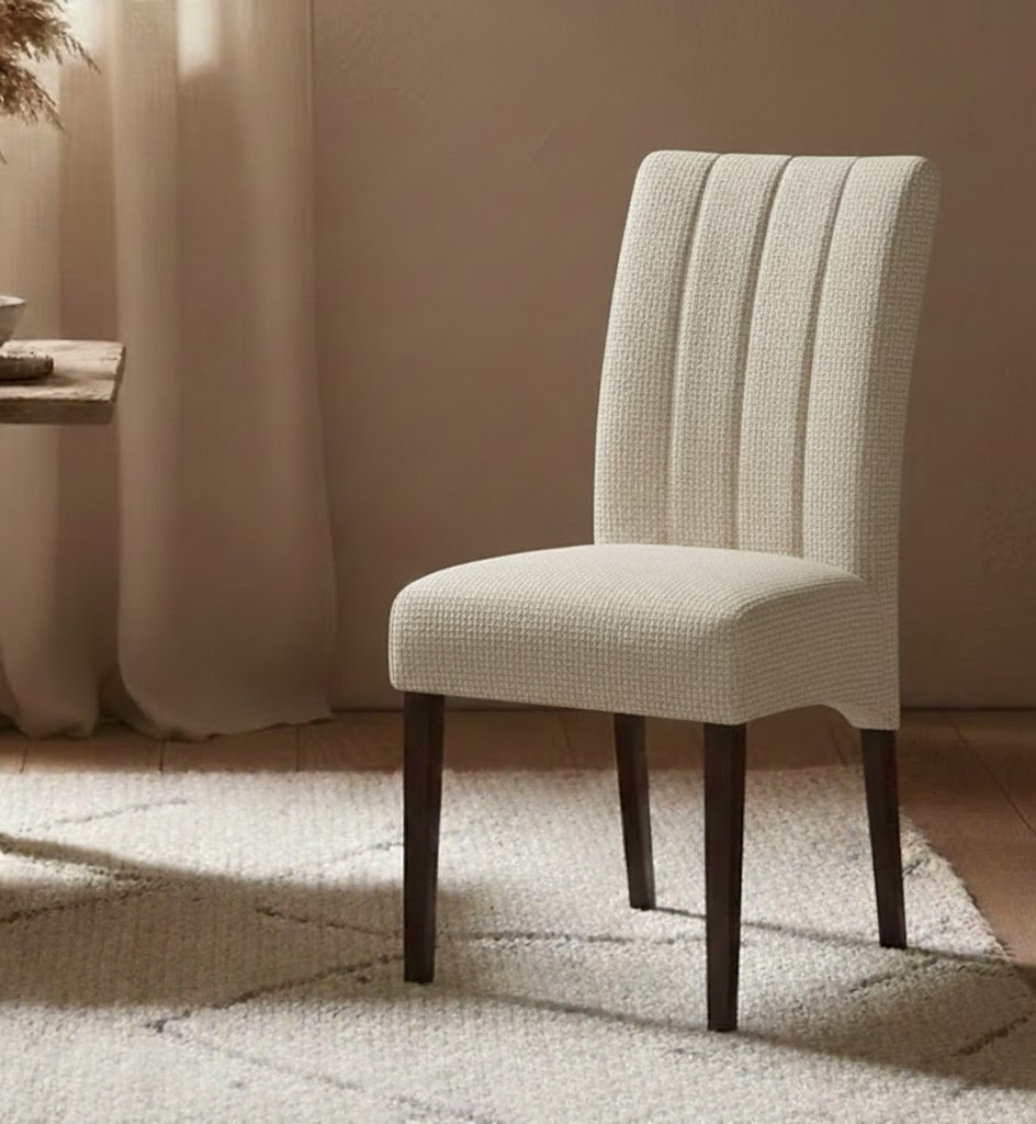 Vlotte eetkamerstoel met verticale stikking in de rugStoelpoten leverbaar in veel houtkleuren